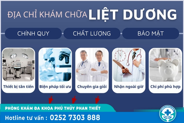 Lời khuyên: Các bác sĩ Phòng Khám Nam Khoa Phú Thủy Phan Thiết cho biết, để chữa liệt dương hiệu quả, nam giới không nên tùy tiện mua thuốc hoặc sử dụng những loại thực phẩm chức năng không rõ nguồn gốc, vì như vậy không thể khắc phục được bệnh mà còn dẫn đến những biến chứng khó lường, thậm chí là liệt dương vĩnh viễn. Tốt hơn hết, hãy tìm đến các cơ sở chuyên khoa nam để được các bác sĩ khám chữa và đưa ra phương pháp hỗ trợ điều trị phù hợp.